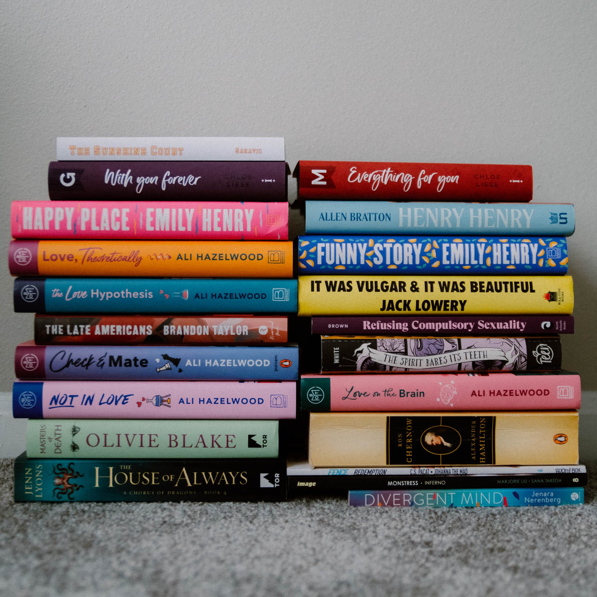 The Bergman Brothers by Chloe Liese - Actually, this was also a shock to read. I binged this seven book series in like a week, and fell head over heels in love with it, to the point that by the end of book four I ordered the very expensive Illumicrate set. This romance series made me feel seen in ways no other books have. It is a piece of my soul, and I think I saw myself flayed alive on the pages of every single installment here. This also cemented a lot of my thoughts about my own neurodivergence. It’s insanely good. I’m still thinking about it. I will be rereading it forever. (Playlist)