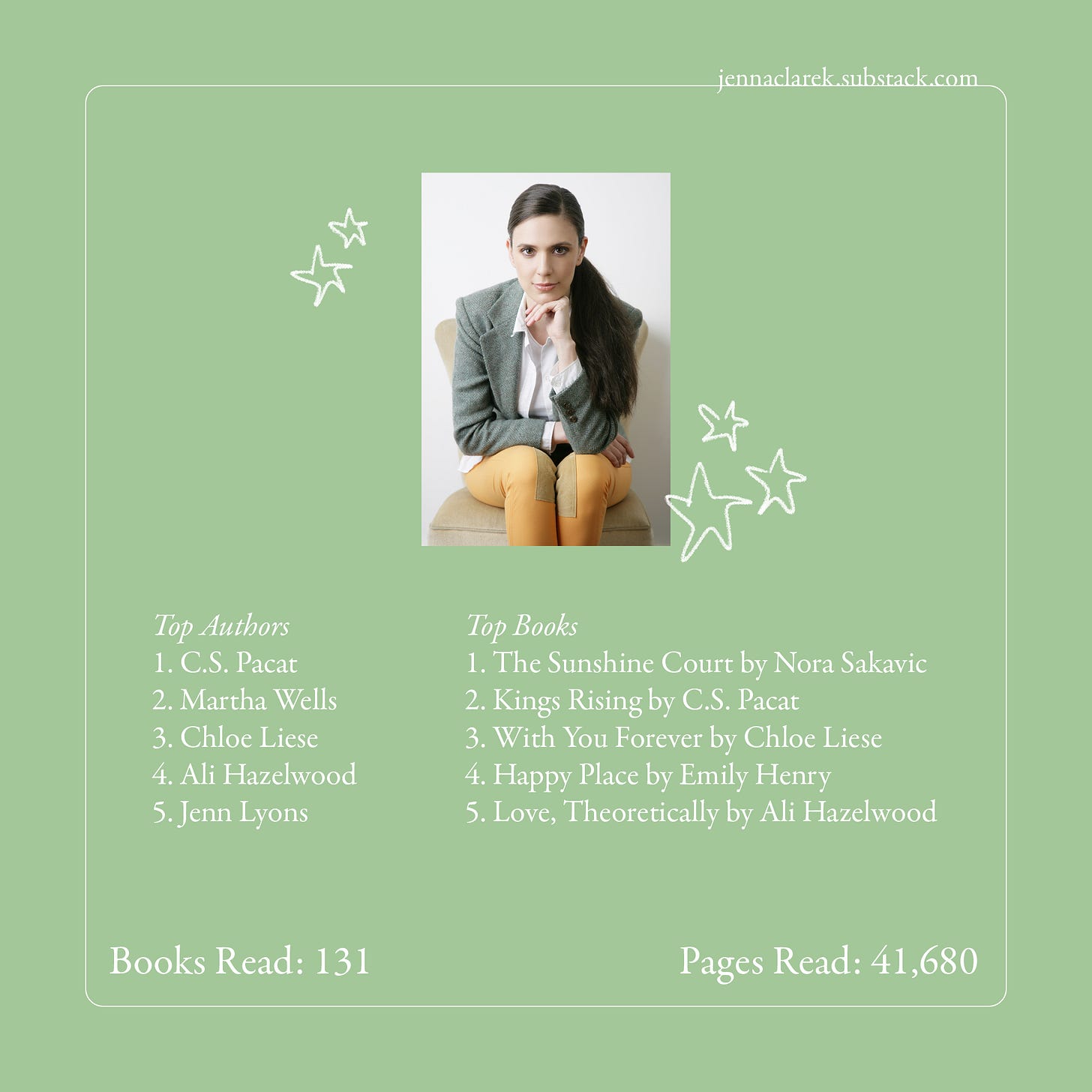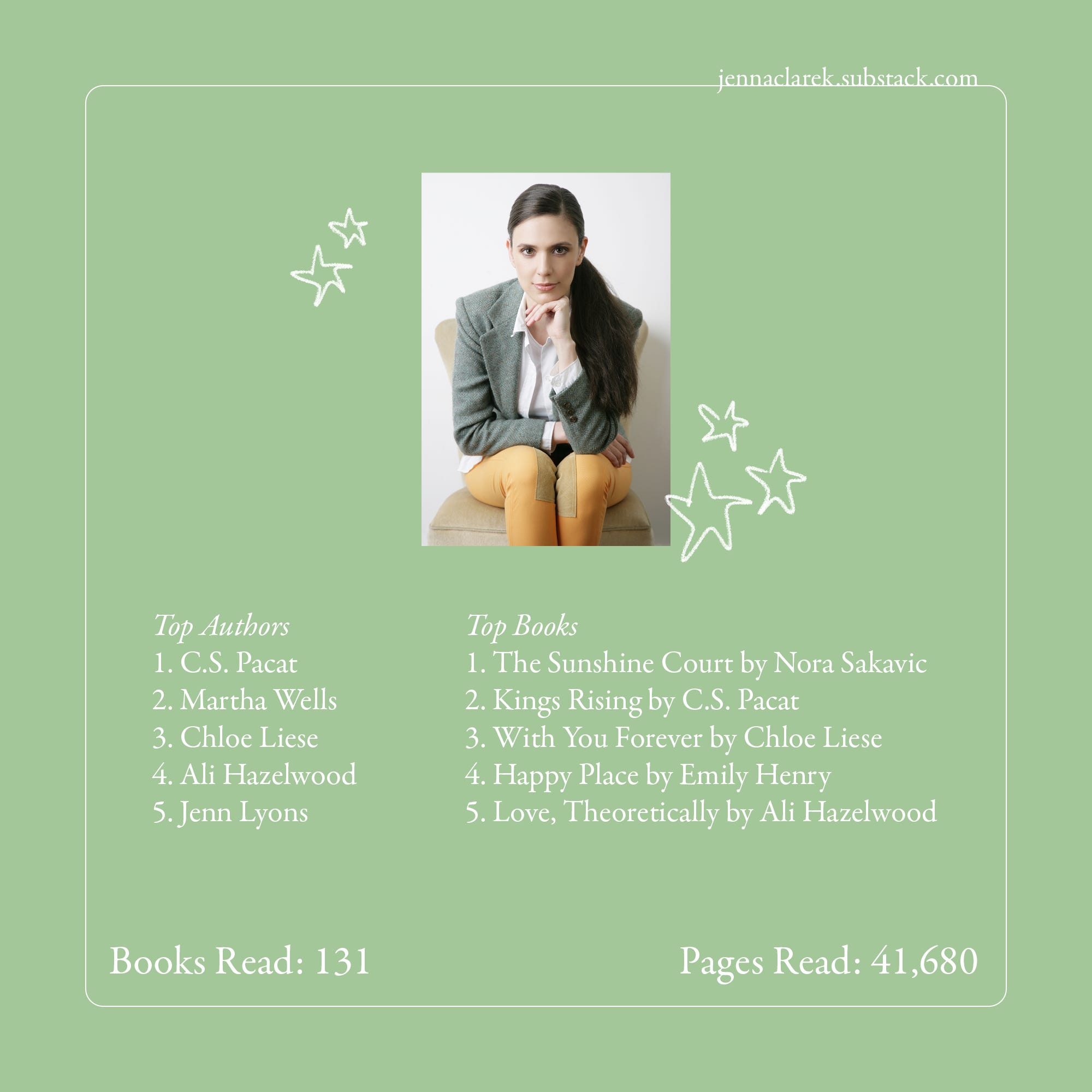 Most-read authors: C.S. Pacat, Chloe Liese, Ali Hazelwood, Jenn Lyons, Martha Wells