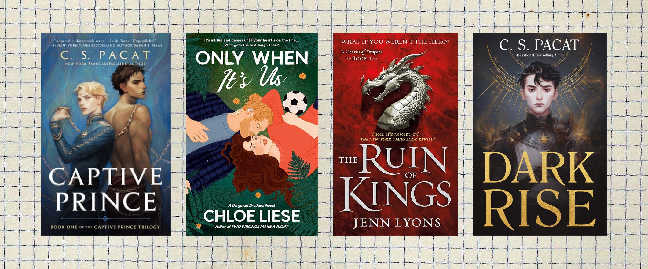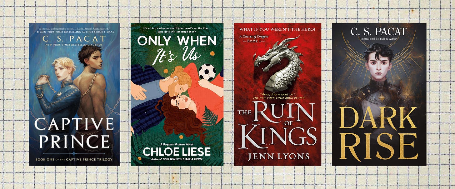 Captive Prince by C.S. Pacat - You guys. I should put this on my biggest surprises list because I am actually baffled that we ended up here. This is my absolute favorite series from this year, so much so that I read it twice in four months. It’s taken over my mind and become a core piece of brainrot. I think about Laurent and Damen every goddamn day. I cannot get over how good this series is. It has incredible commentary on consent, on sex, on slavery…the romance is some of the most inSANE stuff I’ve ever read. It’s funny as hell. I just…I am changed. It’s an all-timer for sure. I feel like the internet lied to me for the last ten years because it’s just nothing like what I expected it to be. (Playlist)