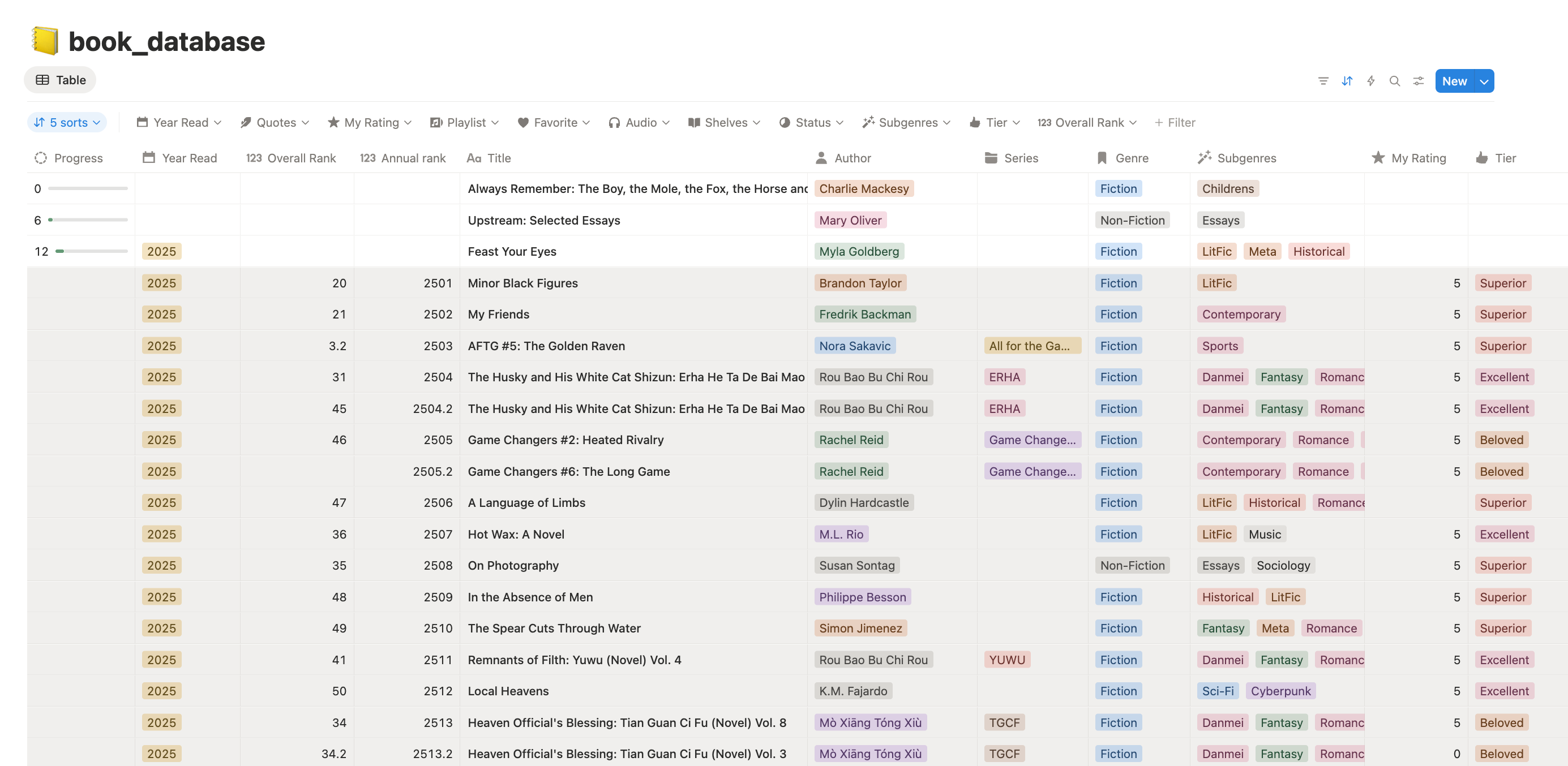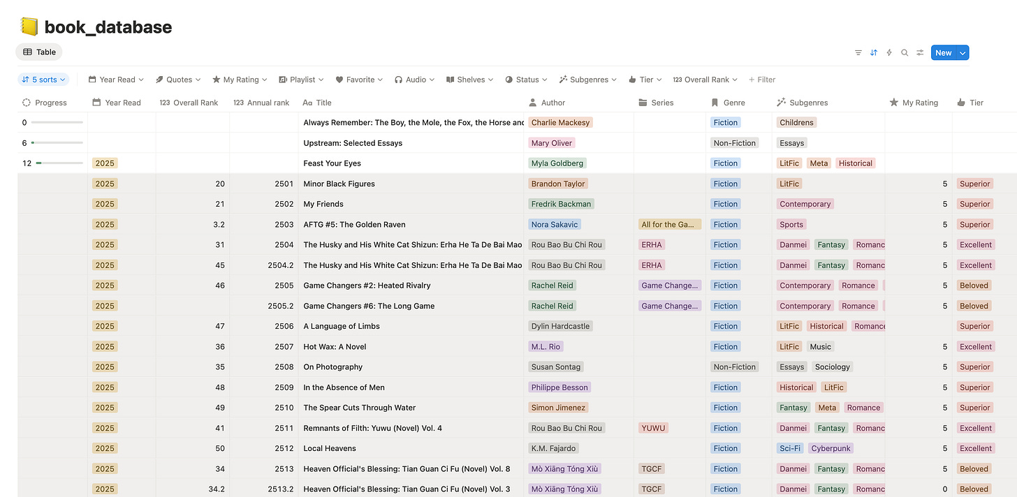 One of the best things I did for myself this year was creating a reading database2 with my GR data in Notion, and now I have a place where I can track what I read with ease and I can easily export and save it offline when necessary. It brings me IMMENSE joy, and ever since I created it in September, I consider it my most prized digital possession. I just love data!!