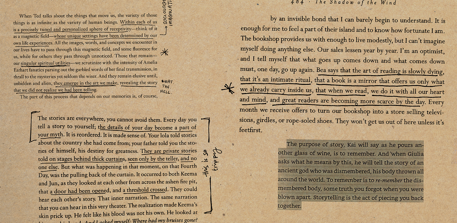 I’m often reading 3 or 4 books at a time, switching constantly between mediums and rereading old favorites. I scribble in my physical books and copy&paste eBook quotes and log my progress so I can look back and remember just what I was thinking when I first read my favorite stories. To some people, the work I put into reading is A Lot, but this is the one hobby I have that I don’t monetize, and it really is one of my biggest sources of joy these days, so of course I put a lot of work into it.