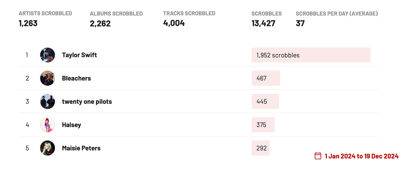 In living like this, we’ve lost some of our earnestness. It feels embarrassing to genuinely recommend something. To share a song to your Instagram story. To try to convince someone why you love a book. We seek out those end of the year favorites lists, but mostly we just look to see which of those books we’ve read or which artists we listened to. Nobody wants to hear you gush about your favorite things, they just want to use you as a gauge: am I cool because my taste is universal or because my taste is so obscure nobody else can relate to me? Spotify Wrapped is all fun and games until you realize you’re just like everybody else. Until your earnest listens of THE TORTURED POETS DEPARTMENT make you basic and cringe because oh my god, everybody listens to Taylor Swift now.