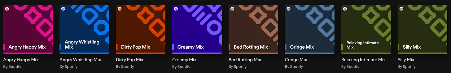 Recently I had a friend ask me if I used the AI playlists on Spotify. I’m talking about the “Discover Weekly” playlist specifically, but there’s also “Daylist” and all those crazy mixes with titles like “Yearning Mix” and “Situationship Mix” and “Delulu Mix” and “Spooky Evil Gay Mix” and “Farm Emo Mix” and “Cat Mix.”