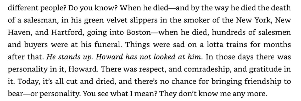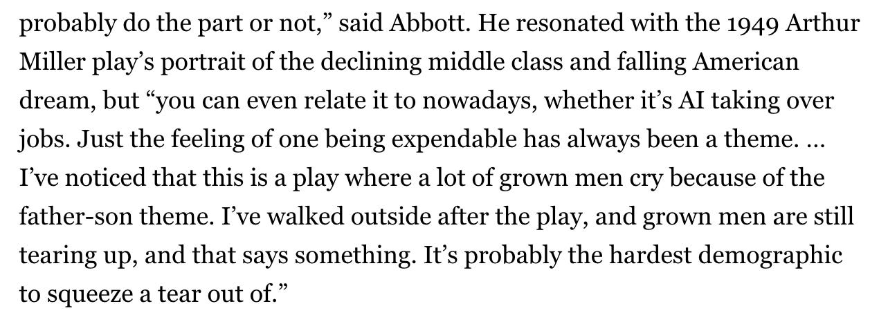 At intermission for Salesman, I looked over and saw the middle-aged man next to me using ChatGPT to find more information about the Studebaker car that was a prop on stage. It made me want to throw myself into the ocean.