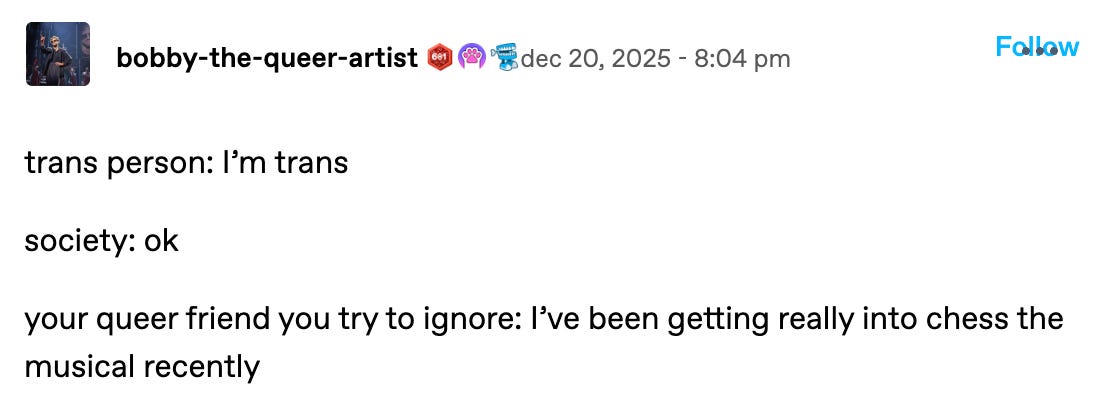 Unbeknownst to me, the opening overture for the 2025 Broadway Revival begins with an orchestral instrumental of “Nobody’s Side,” and as I sat there, watching the big neon CHESS sign light up the stage, I burst into tears. This song has been there for me since I was thirteen with my iPod Nano, and it was surreal to get to see it in New York at my beloved Imperial theater.