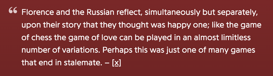 The story involves a politically charged, Cold War-era chess tournament between two grandmasters, one American and the other Soviet, and their fight over a woman who manages one and falls in love with the other. Although the protagonists were not intended to represent any real individuals, the character of the American grandmaster was loosely based on Bobby Fischer, while elements of the story may have been inspired by the chess careers of Russian grandmasters Viktor Korchnoi and Anatoly Karpov. (x)