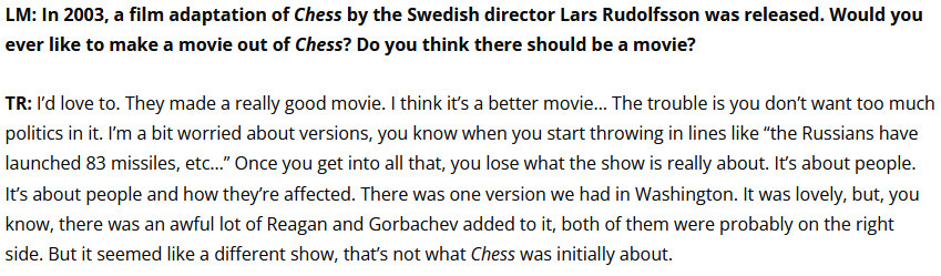 Now, I know what you’re thinking. You didn’t realize there was a musical about chess. And you had no idea that musical is about chess during the Cold War. And you didn’t know that the guys who did the music are from ABBA. And you’re asking yourself why the fuck would someone make this a musical and why would anyone revive it on Broadway?