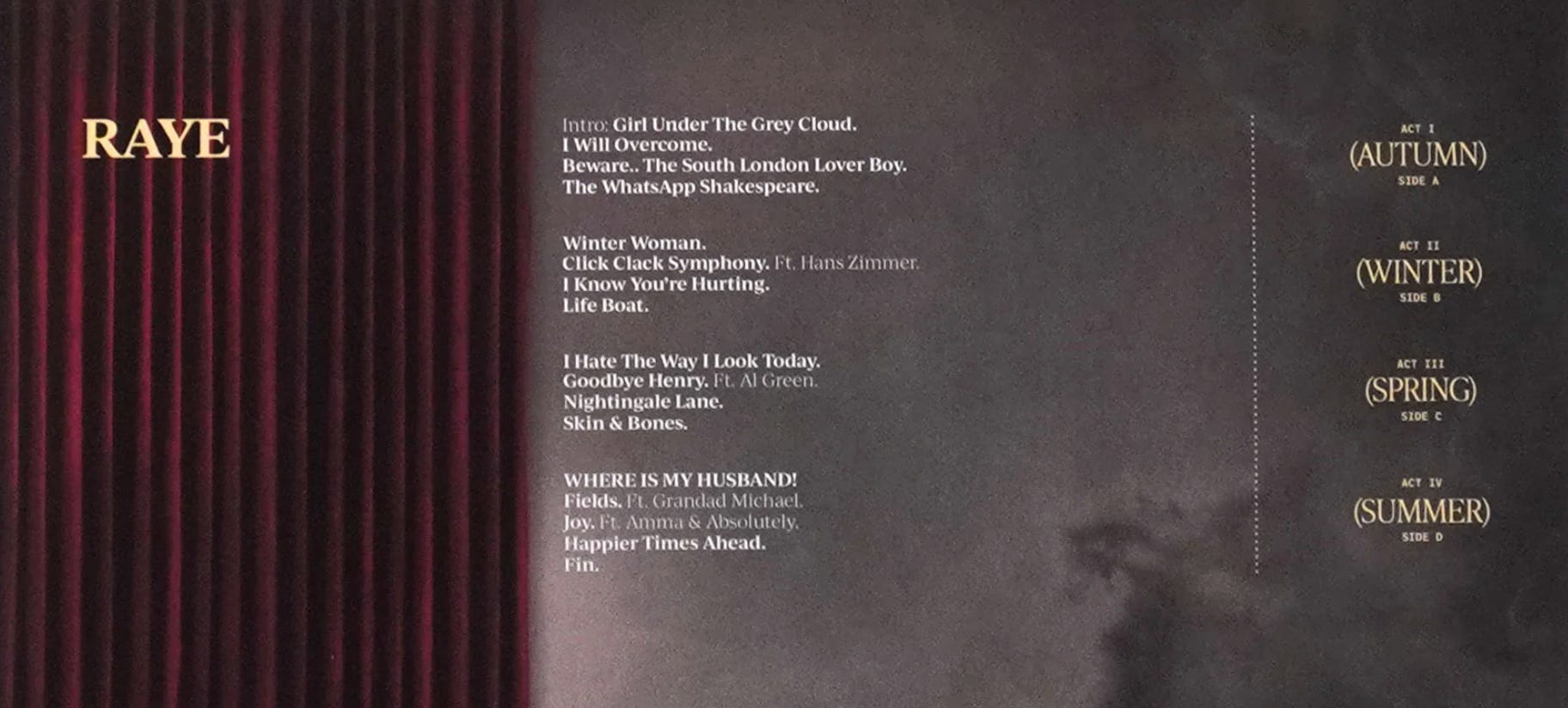 I first listened to this record in my headphones on a Southwest plane to Tampa for my cousin’s wedding. It was Friday night, the day of release, and I saved the album for plane listening because I wanted to fully immerse myself in the content. I sat next to a very sweet Black woman who told me later that she was visiting her daughter, and god bless her because I think I spent a good hour of the flight just stimming and weeping and bopping along in my seat. By the time we landed, she tapped me on the shoulder and asked what I was listening to because I was so animated. And thus began my newfound mission as a RAYE evangelizer.