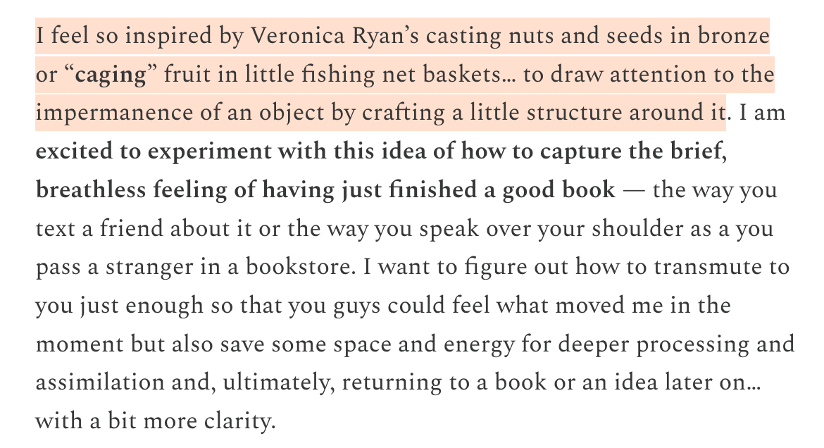 She recently put out a piece about her monthly reading, sharing that she’s interested in testing new ways of exploring books in her newsletter. She mentions “containers” in regards to reading and asks her readers to reflect on how they (we) structure their reflections and thoughts about what they’re reading. I think a lot of us get bogged down by format and structure when talking about books online, especially those of us who have been doing books online for a long time, and I love seeing new ways of thinking in regards to this phenomenon. Very curious to see where she goes - the comments on that post are wonderful!